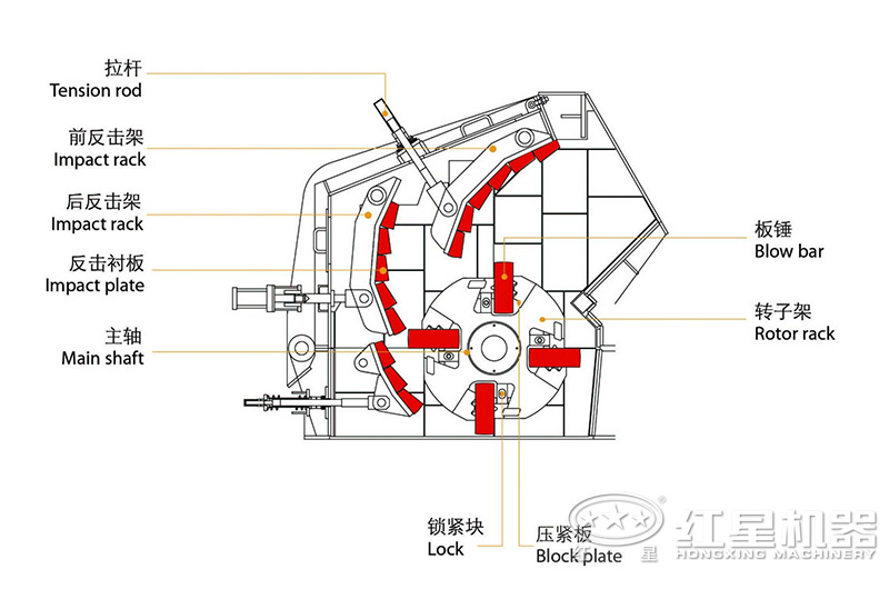 物料是利用高速旋轉(zhuǎn)的板錘錘擊進(jìn)入破碎區(qū)域,并受到板錘的高速?zèng)_擊而破碎,物料在設(shè)定的流道內(nèi)沿第一、第二反擊板經(jīng)一定時(shí)間一定長(zhǎng)度的反復(fù)沖擊路線使物料破碎。