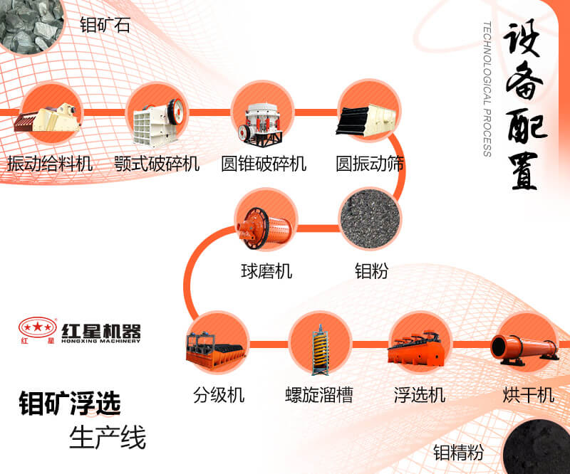 開采而來的天然鉬礦首先要經(jīng)過鄂式破碎機的粗碎,進行初步的破碎,隨后將符合粒度要求的鉬礦物料經(jīng)圓錐破碎機進行再次的細碎,合格的物料經(jīng)提升機送至料倉等待研磨。由給料裝置將物料送入球磨機進行研磨,隨后將研磨后的鉬礦細料送入螺旋分級機進行洗凈和分級,隨后經(jīng)由攪拌桶送至浮選機進行浮選作業(yè),浮選作業(yè)主要將所需礦物與其他礦物分離開,最后通過高產(chǎn)濃縮機將礦物中的水分去除,就得到了生產(chǎn)所需的鉬礦原料。